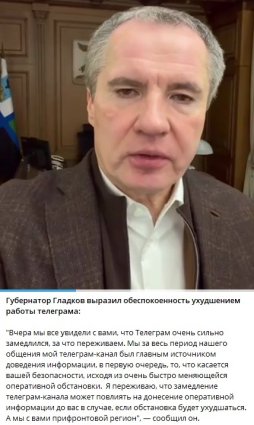 "Вчера мы все увидели с вами, что Телеграм очень сильно замедлился, за что переживаем. Мы за весь период нашего общения мой телеграм-канал был главным источником доведения информации, в первую очередь, то, что касается вашей безопасности, исходя из очень быстро меняющейся оперативной обстановки. Я переживаю, что замедление телеграм-канала может повлиять на донесение оперативной информации до вас в случае, если обстановка будет ухудшаться. А мы с вами прифронтовой регион.