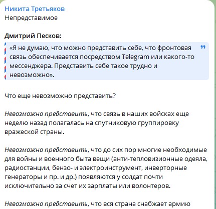 Здесь поспорить невозможно. Система управления и связи ВС РФ никогда и ни по каким документам не подразумевала и не включала использование «Старлинков», а значит, их отключение не могло на нее повлиять. О самом управлении и связи не сказано, сказано о системе.