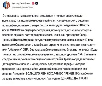 Трамп вот украл молоток. Публично. На 1,5 кг. Золотой. Сей предмет изготовили как символ плана Золотой молот для Совета мира, и старый клептоман не смог удержаться... Президент США, миллиардер, владелец высоколиквидных и быстродорожающих активов, спер золотой молоток. Точка. А еще обиделся на Верховный суд и наказал весь мир, раз не может судей, повысив пошлины планете на 5%. Финиш. Щтука посильнее Фауста Гете.