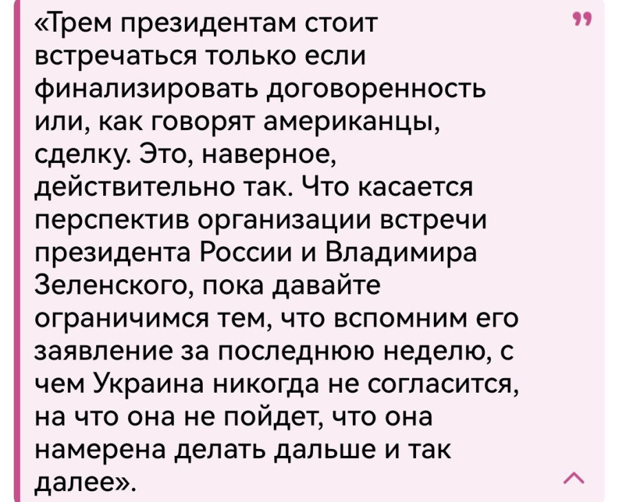 1. Война закончится встречей Путина и Зеленского при посредничестве Трампа. Тем самым за Зеленским признается легитимный статус. И положение президента Украины.