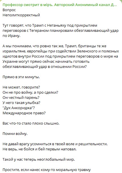 А мы понимаем, что ровно так же, Трамп, британцы те же израильтяне, европейцы при содействии Зеленского и полезных идиотов внутри России под прикрытием переговоров о мире на Украине могут прямо сейчас начинать готовить обезглавливающий удар в отношении России?