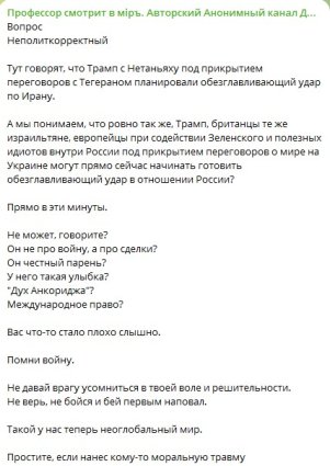Интересно, будут ли сделаны выводы? Или всё на переговорном треке с американскими партнёрами продолжится как ни в чём не бывало. Однако же ровно до того момента, пока в темечко не клюнет жареный петух. В то время как Москва упорно не желает вести огонь по штабам (даже в случае, когда речь идёт о лидерах режима, который она сама же называет неонацистским), Вашингтон только и делает, что их атакует. Причём необходимо чётко понимать, что для администрации Трампа российское политическое руководство является ровно таким же штабом как и иранское (а вовсе не "уважаемыми партнёрами").