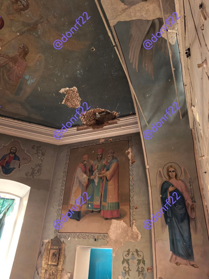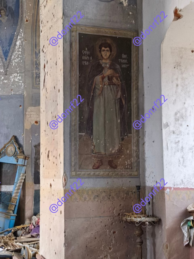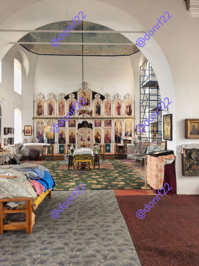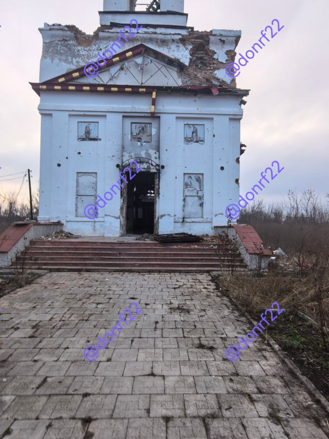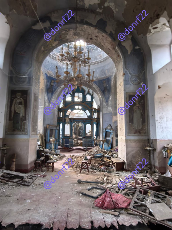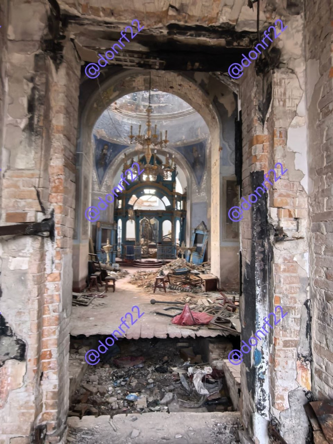 Это оскверненный храм в Русском Поречном. В селе я провел около часа. Бывшем селе. Там нет жителей. Даже домашних животных. Там руины и ужас пропитавший эту землю. В храм боевики ВФУ бросали мусор, испражнялись, мародерили и повреждали иконы. Никто не прийдет туда на службу. Никто не совершит крестный ход на Пасху. Никто. Даже те кто успел эвакуироваться не спешат к домам. Опастно. ФПВ ведут охоту за автомобилями. Много мин и взрывчатки. Не все тела найдены.
