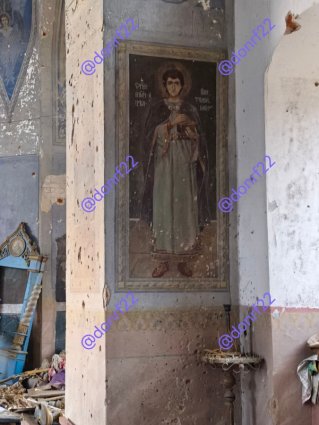 Второй храм с села Махновка. Там живет семейная пара. Средних лет. Они храм привели в порядок. Там нет священника, но люди в храме будут. Двое. Те кто отказался от эвакуации после освобождения. Живет под грохот артиллерии без света, газа и воды. Убирает храм. Собрали выживших котов и собак, и подкармливают и их. По сути с подаяния. Кто из выживших туда заскакивает - берет с собой продукты. С колокольни храма снайпер убивала мирных. Потом в нем жили хохлы. И тоже загадили.