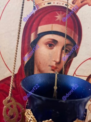 И икона из Махновки, которая плакала во время оккупации. Присчмотревшись можно и сейчас увидеть порез на щеке и струйуку крови: