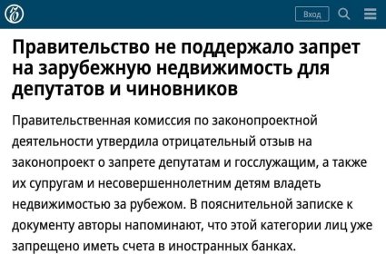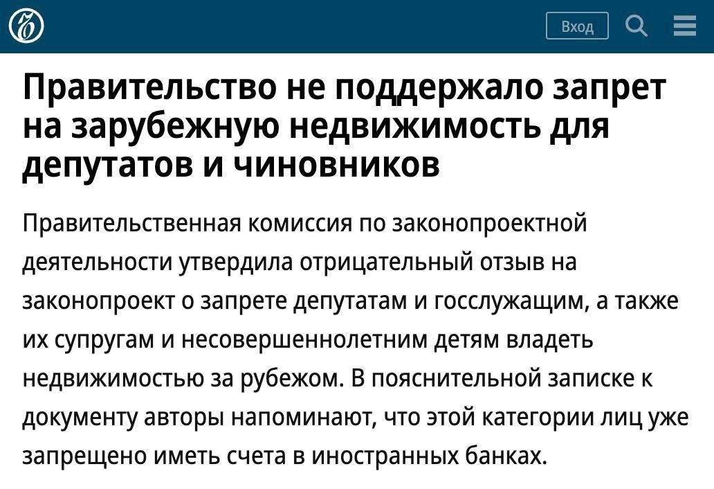 Правительственная комиссия по законопроектной деятельности утвердила отрицательный отзыв на законопроект о запрете депутатам и госслужащим, а также их супругам и несовершеннолетним детям владеть недвижимостью за рубежом.