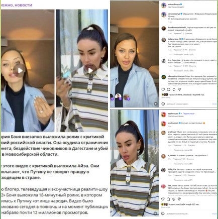 Смешно, казалось бы. Но вот Боня, 13 млн (!) подписчиков "Путина все боятся, до него не доводят правду" и т.п. Под миллион реакций, более 50.000 комментариев. И Айза, 4+ млн подписчиков с тем же посылом "Мы устали бояться, Путина боятся, Путину врут" и т.п.
