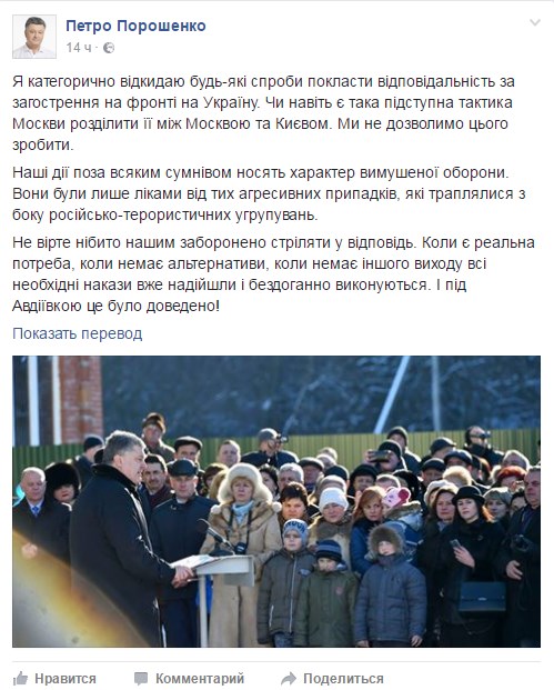 «Наши действия несомненно носят характер вынужденной обороны», - написал Порошенко.