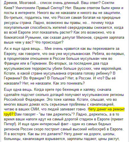 Еще одна вещь. Когда орете про беженцев и халяву, сначала сделайте подсчет сколько дотаций получают мусульманские регионы Российской Федерации. Это тоже халява. Кстати, слышал, что во многих ваших домах есть серьезные проблемы с канализацией, читаю в ваших СМИ, что людей заливает говно. Нету денег на ремонт труб? Вам говорят - "вы там держитесь"? Ладно, держитесь, а в то время ваши налоги идут на самый дорогой стадион в Европе (привет Питер!). И еще один интересный факт - один из самых бедных регионов России скоро построит самый высокий небоскреб в Европе. Я в восторге. Как вы это делаете? Нету денег на дороги, школы, больницы, канализация взрывается, зарплаты падают, цены растут, вас просят меньше кушать, больше думать про Родину, а не про себя и в это же время ваши хозяева тратят миллиарды долларов на стадионы, небоскребы, дворцы и яхты.