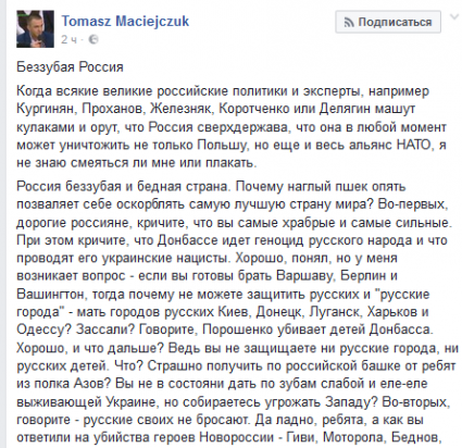 Здесь, - и есть проблема, и заключается она в том, что мне категорически, до омерзения неприятна писанина пана Мацейчика, но опровергнуть его тезисы мне нечем. Разве что выделенное желтеньким, насчет ремонта труб, бьется влет тютческим "умом Российскую Федерацию не понять", но и только, а все остальное, - "А в ответ крики и посты в интернете. Никого вы не наказали и никого не защитили", и дальше, от и до, вдоль и поперек, сверху донизу, - до такой степени выглядит соответствующим реальности, что, скорее всего, именно реальностью является, - и я прошу всех, кто может, помочь мне опровергнуть зарвавшегося пана. Надеюсь, это не сложно...