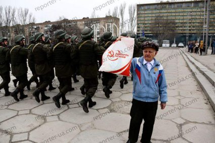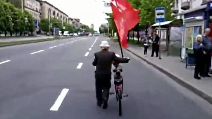 Он вышел перед строем вооруженных нацгвардейцев с теми советскими и российскими флагами, которые у него были. И пусть это всего лишь пакет Компартии Украины и мастерка от спортивного костюма, с флагами мужчина мог просто не дойти до места марша. Но он смело поднял символ СССР, символ, который был начертан на знамени Победы, а на спине у героического деда красовалась надпись «Россия».