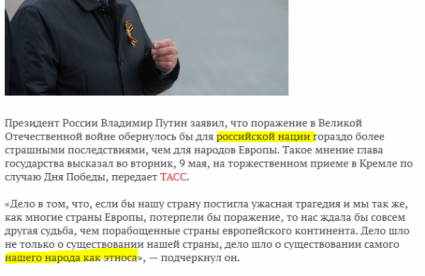 Таким образом, речь шла не о смертельной угрозе существованию некоей "российской нации", которой не существовало, но о смертельной угрозе существованию [i]русского народа, как этноса[/i], который, в случае победы Гитлера, в отличие от прочих, действительно, перестал бы существовать.