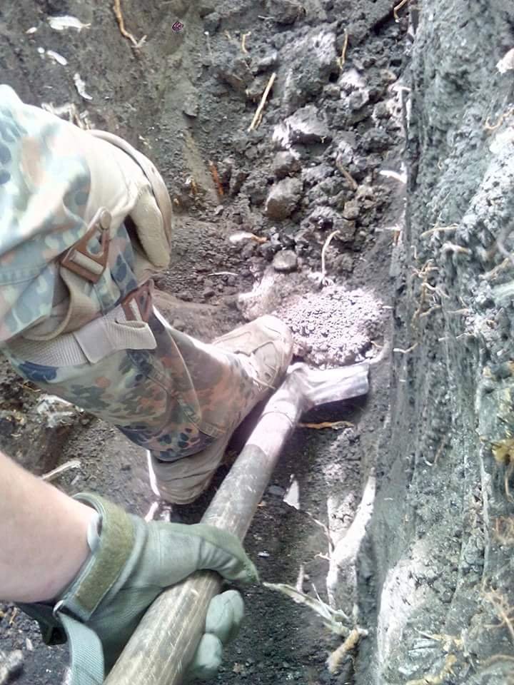 Умывшись, мы пошли копать. Если Вы думаете, что на войне солдаты всё время стреляют и штурмуют Рейхстаг, Вы заблуждаетесь. Основное занятие личного состава на передовой – земляные работы. Остановились на одном месте на час – выкопай индивидуальный окоп для стрельбы лёжа. Если подразделение не двигается пол дня, углуби и расширь свой окоп для стрельбы с колена, стоя, организуй индивидуальную стрелковую позицию. Продолжаете стоять вторые сутки – начинайте рыть траншеи нормального профиля, соединяя индивидуальные ячейки путями сообщения и устраивая подходные пути. Потом углубляйтесь до полного профиля, разбирайте деревянные конструкции ближайших руин и устраивайте блиндажи в три наката, валите лес, находите самопогрузчики, автокраны, и реквизируйте все доступные в округе железобетонные конструкции, блоки ФБС и тому подобное. Через месяц-другой стояния на одном месте, Вы построите свою линию Мажино. Но помните – по закону подлости, когда стройка наконец окончена, подразделение перебросят куда-нибудь в поля, где всё нужно начинать сначала, а на ваши позиции зайдут смежники, чтобы наслаждаться плодами чужих трудов.