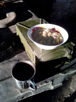 Благоустройством территории мы занимались, не снимая касок и бронежилетов, потому как на фронте прилетает всегда неожиданно. Обливаясь потом, сильно уставшие, дошагали мы до домика, расселись во дворе на ящиках с БК и заказали Гансу чаю. Ганс, единственный известный мне еврей шахтёр, был и остаётся богом полевой кухни, и благодаря ему взвод, а иногда и вся рота, питались вкусно и зачастую досыта. Но о нём как-то в другой раз, отдельно. А пока мы, наслаждаясь крепкой заваркой и дешевыми сигаретами, беседовали о “делах: о башмаках и сургуче, капусте, королях, и почему, как суп в котле, кипит вода в морях”, одним словом, сибаритствовали. Если у вас есть БК, чай и сигареты, вы – счастливые люди.