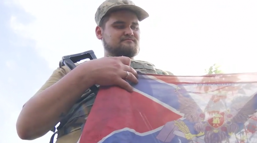 Этот флаг УНИАН объявило захваченным в Желобках, это при том что символика Новороссии в ЛДНР под полным запретом, и где бравые ВСУшники добыли такой "трофей", можно только предполагать, но точно не в боевой части ВСН.