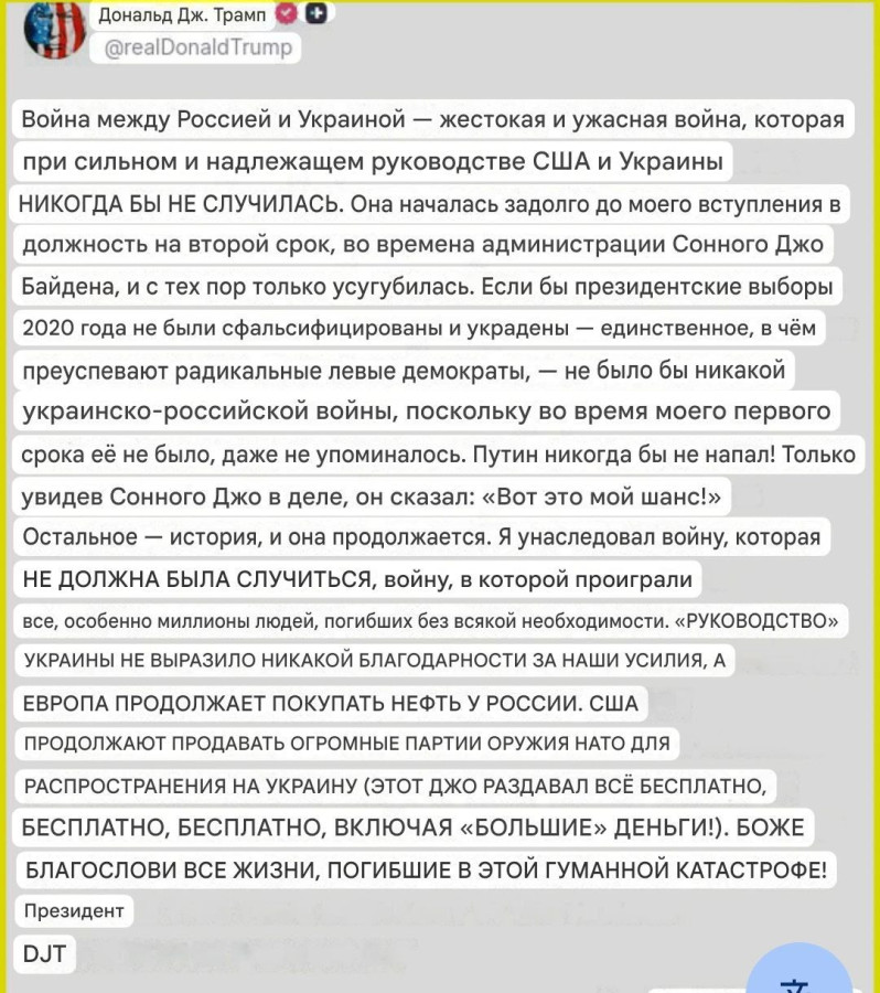 Прошлым утром Блумберг опубликовал расшифровки якобы разговоров Ушакова и Уиткоффа и Ушакова и Дмитриева. Если кратко - с текста следует что через Уиткоффа Трампу подсунули российский мирный план. Которым он давит Киев. То есть президент США, исходя, опять же, исходя из текста, лоббирует интересы РФ. В пользу заключения новых Минских соглашений. Что само по себе для американцев изумительно. До края и даже выше.