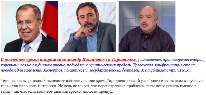 В последнее время напряжение между Кишиневом и Тирасполем усиливается. Судя по всему, противоречия сторон, коренившиеся на глубинном уровне, подходят к своему критическому пределу. Тревожная в этот сложный момент конфронтация стала поводом для заявлений экспертов, политиков и даже государственных деятелей. Мы публикуем сегодня три из них, они носят концептуальный характер и дают возможность взглянуть на Приднестровье с нескольких сторон.