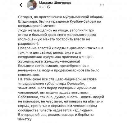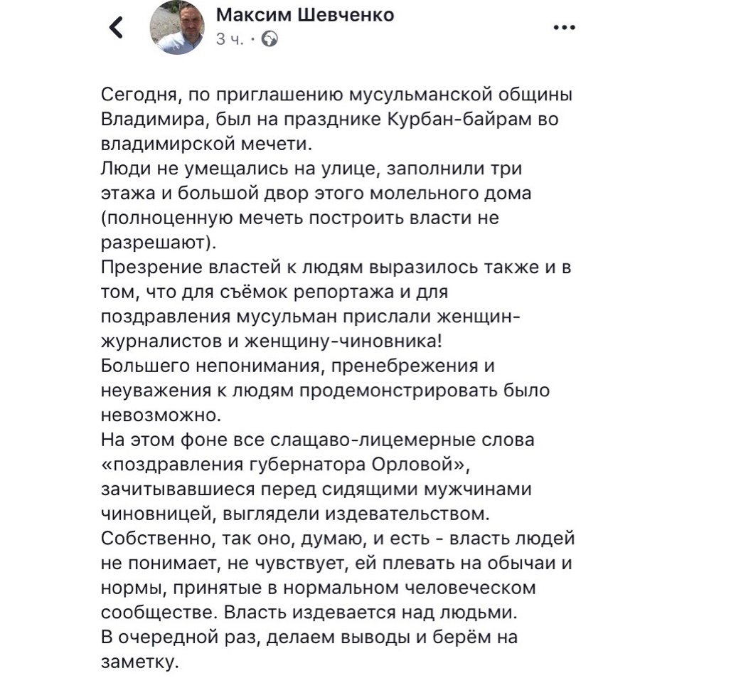 "...В Духовном управлении мусульман Владимирской области рассказали, что не видят ничего плохого в присутствии женщин на празднике. «Это Елена Владимировна Анисимова, глава комитета общественных связей и проектов [администрации региона]. Она приходит каждый год и поздравляет верующих. Это нормально. Конечно, желательно, чтобы женщины, которые заходят в мечеть, были покрыты. Но по-моему, все были в платках», — объяснил имам-мухтасиб Азат хазрат Мунавиров. По его словам, в мечети отдельные молельные залы для мужчин и для женщин. «Но сегодня торжественная часть была в мужском зале, поэтому Елена Владимировна и журналистки тоже были там», — добавил представитель управления"