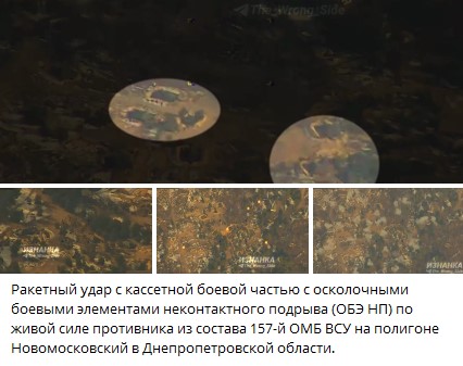 Ракетный удар с кассетной боевой частью с осколочными боевыми элементами неконтактного подрыва (ОБЭ НП) по живой силе противника из состава 157-й ОМБ ВСУ на полигоне Новомосковский в Днепропетровской области.