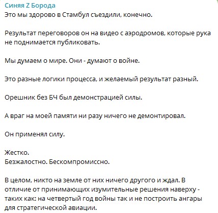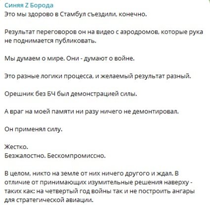 ...Мы думаем о мире. Они - думают о войне. Это разные логики процесса, и желаемый результат разный.